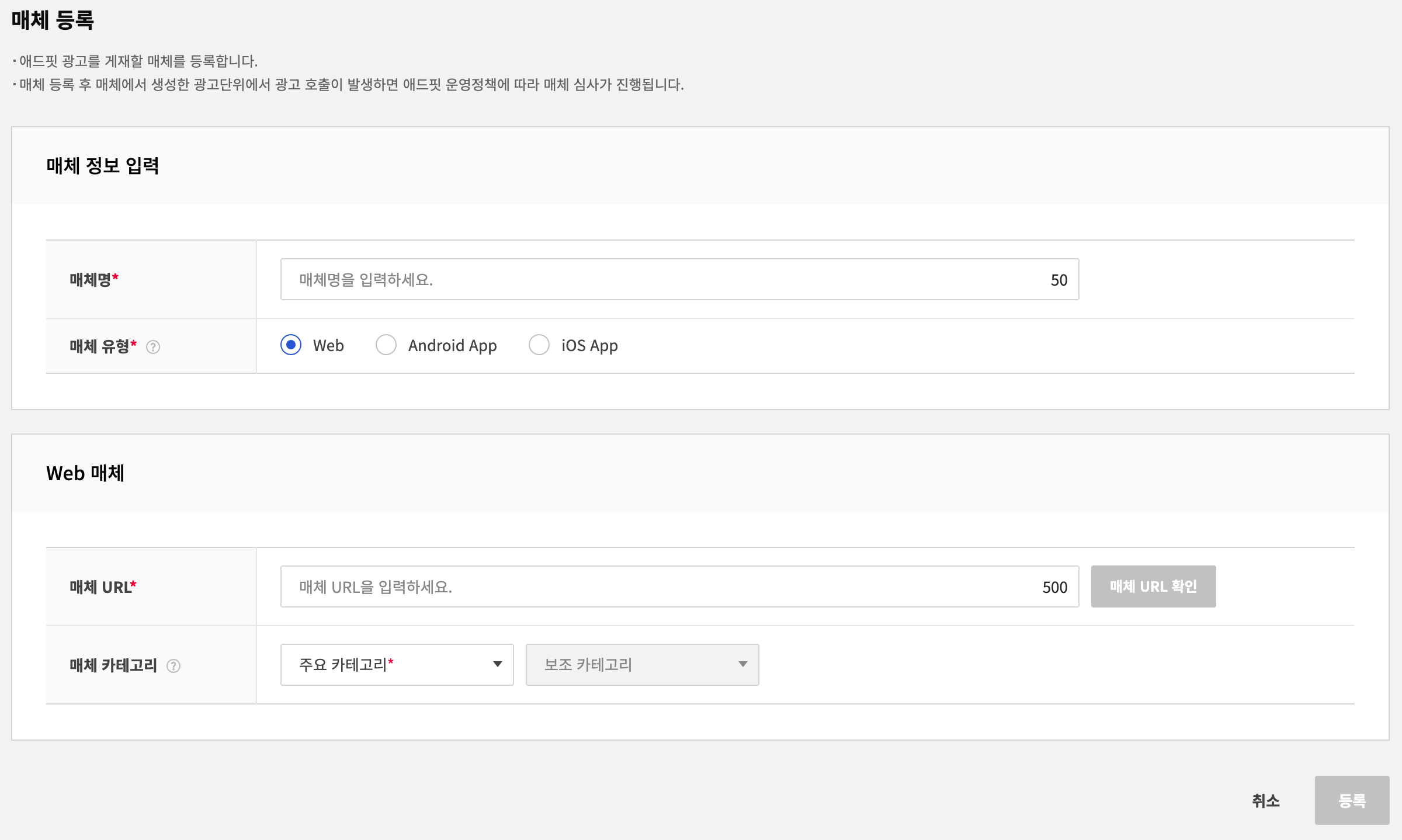 1. 매체명 : 자신이 원하는 이름을 부여해주시면 됩니다. 등록 후 광고 관리 목록에 표시되는 이름입니다.