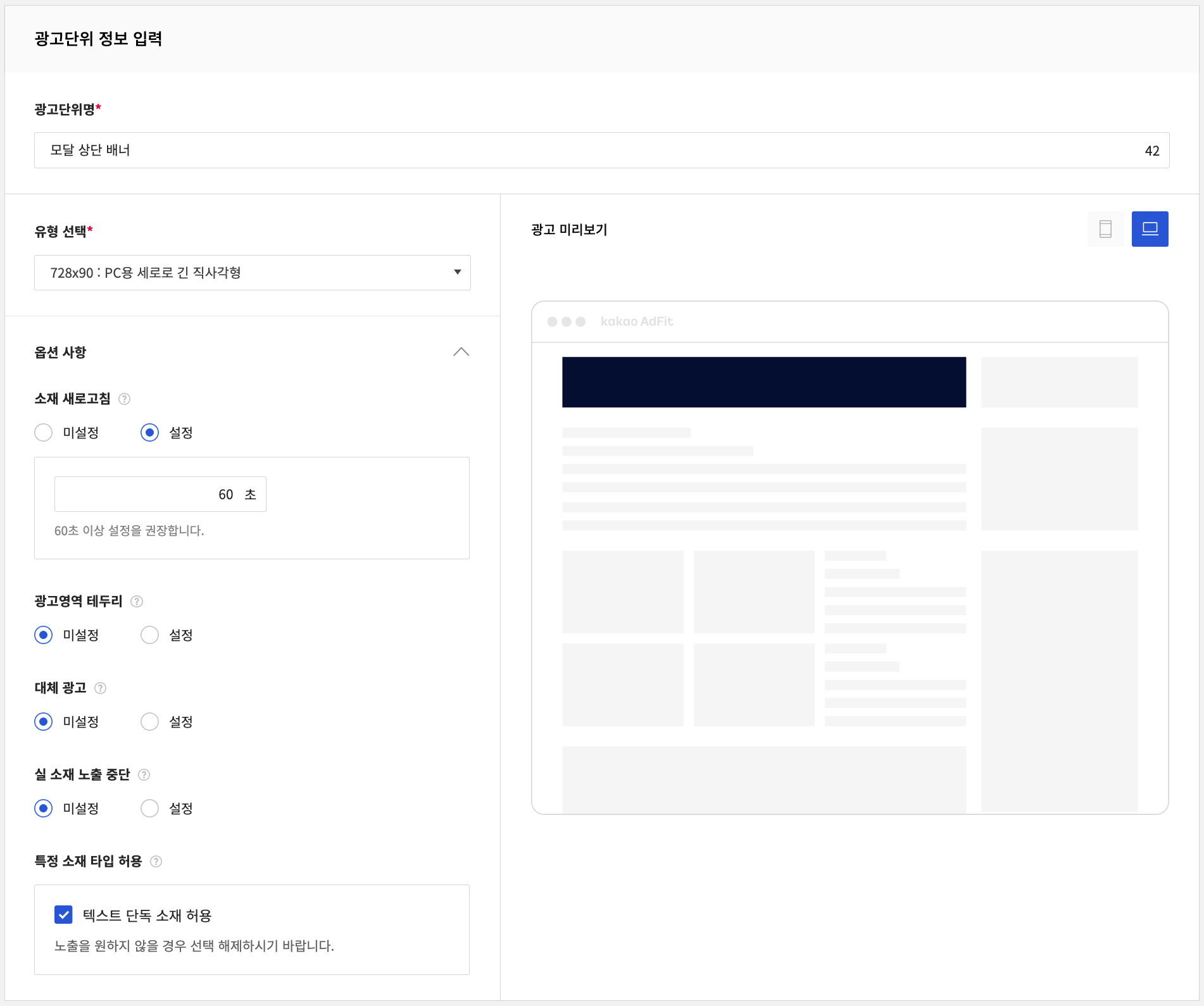 1. 광고 단위명: 웹사이트에 개시할 광고를 구분할 이름입니다. 한개면 상관없겠지만 여러개를 등록한다면 위치와 목적에 맞게 이름을 부여하면 됩니다. ex) 모달상단배너, 브라우저 하단 배너 등등
